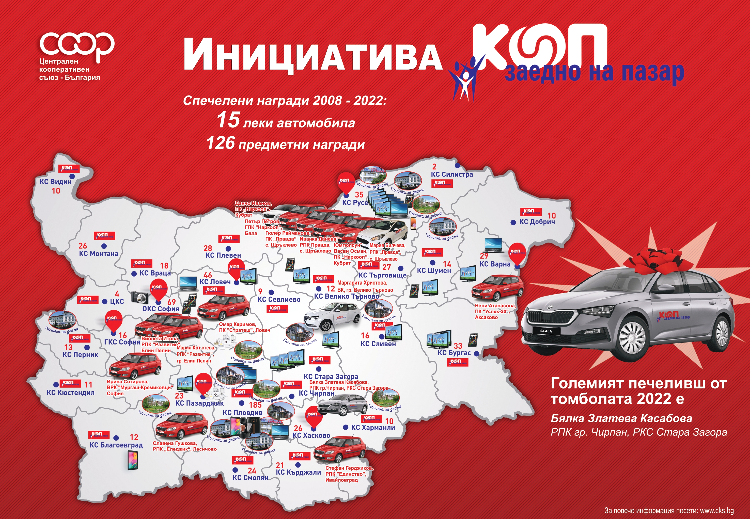 От 1 декември 2022 г. до 30 ноември 2023 г. е в ход 16-ото издание на Инициативата „КООП – Заедно на пазар“. Право на участие в томболата за традиционния лек автомобил и още редица страхотни награди имат всички член-кооператори, които в 12-месечния период реализират покупки на стойност поне 1200 лв. в магазините от Търговска верига КООП. Томбата се тегли на декемврийския управителен съвет на ЦКС в присъствието на членовете на ръководните и контролни органи на Съюза.