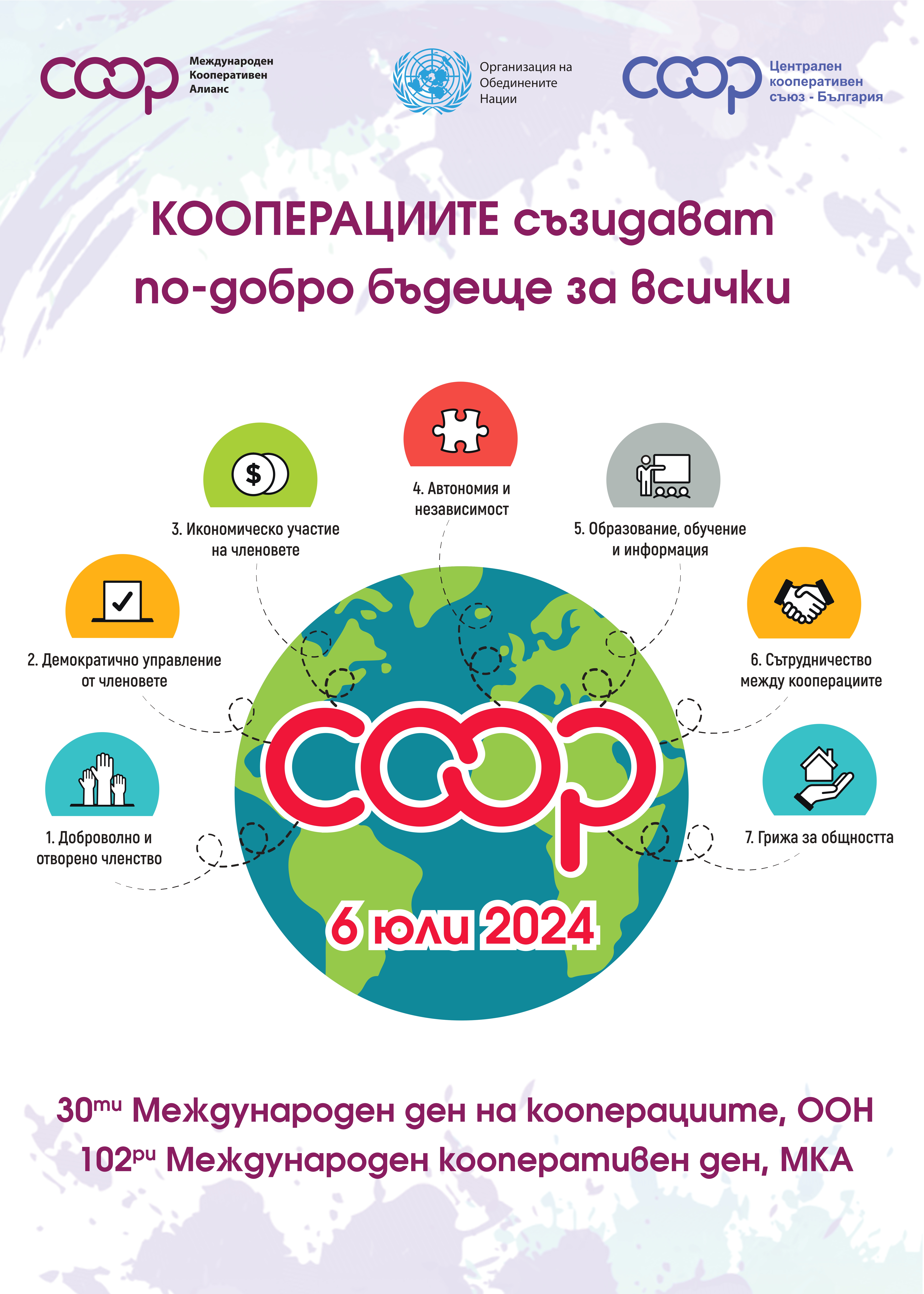 Централният кооперативен съюз поздравява всички над 100 000 член-кооператорa и техните семейства по повод 6 юли 2024 година 102ри Международен кооперативен ден, МКА и 30ти Международен ден на кооперациите, ООН.