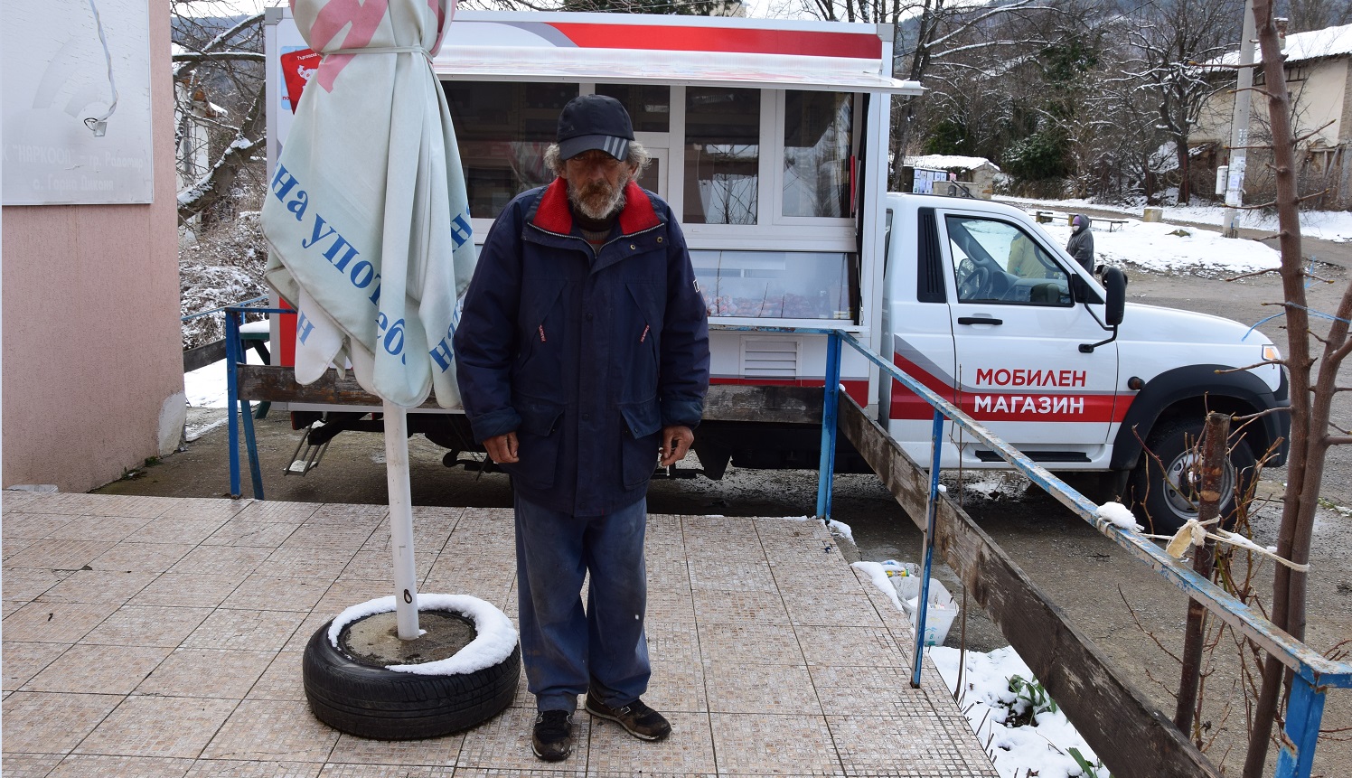 „Отскоро живея тук. Мобилният магазин КООП много ни улеснява, защото преди ходех веднъж в месеца в София и мъкнех торби с храна оттам“, казва ми с усмивка видимо интелигентна жена с черно яке. Иван наистина си купува три вафли и моли да го снимам пред мобилния магазин. Той чака с нетърпение идването на буса всеки понеделник и четвъртък, за да си вземе от любимите вафли и да намери с някого да поприказва. „Живея в първата къща, имам коне, крави, кокошки, пуйки – като зоологическа градина е“.