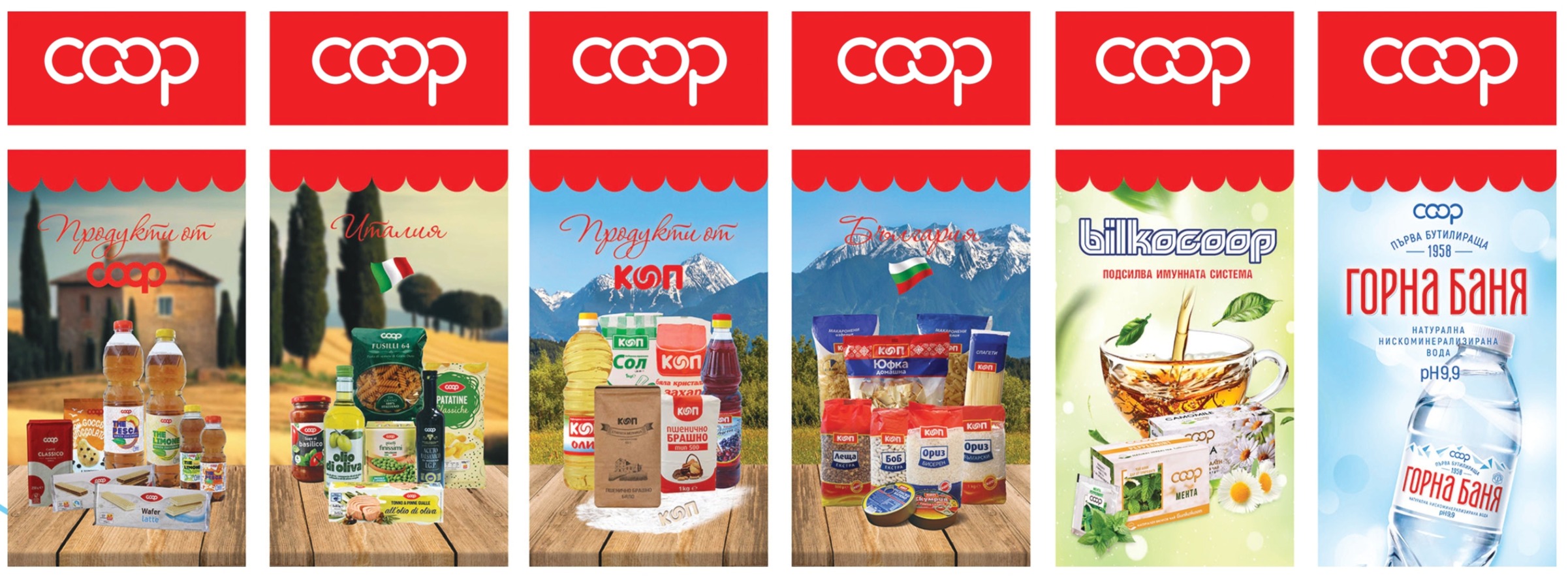В магазините от търговска верига КООП се предлага богат асортимент от стоки с марка КООП с добро качество и на достъпни цени, произведени от: