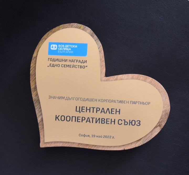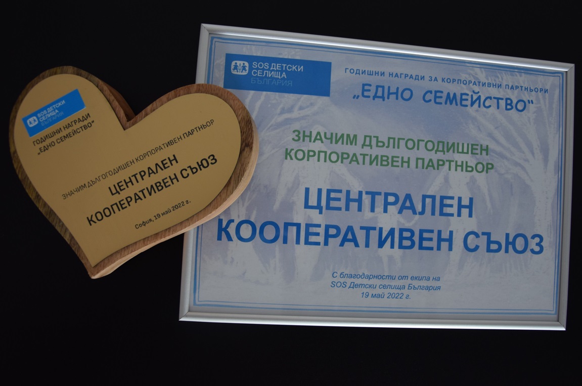 Социалната мисия на Централния кооперативен съюз получи признание за пореден път. Съюзът бе отличен с приз за "Значим дългогодишен корпоративен партньор" на Годишните награди за кооперативни партньори "Едно семейство" 2022 на "SOS Детски селища България".